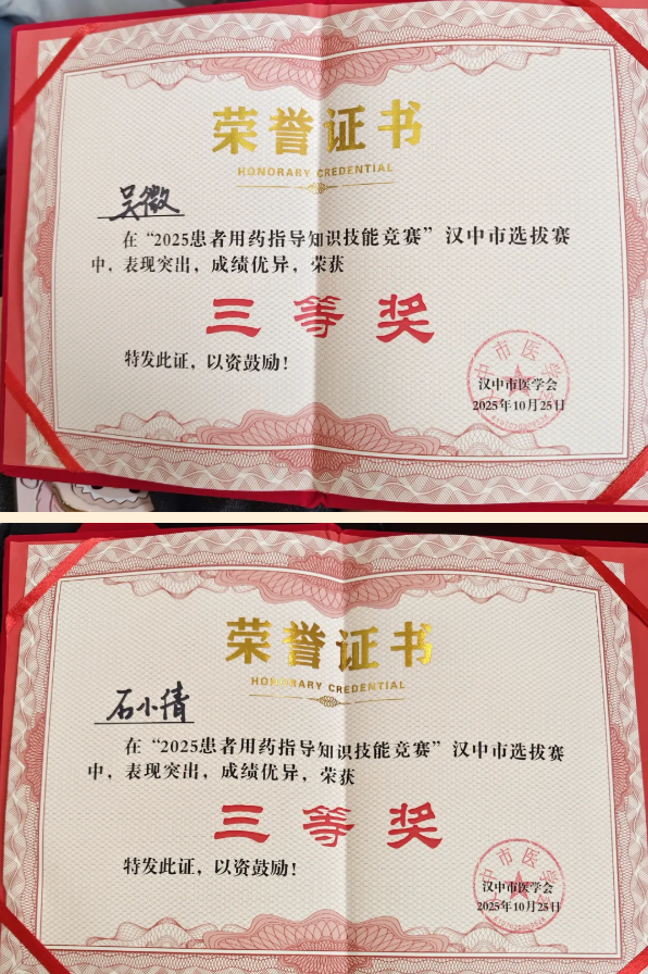 10月25日,由汉中市医学会主办、汉中市人民医院承办的“2025患者用药指导知识技能竞赛汉中市选拔赛”圆满落幕,我院药剂科吴微、石小倩两位药师,经过激烈角逐,凭借扎实的专业功底和出色的临场发挥,在全市精英汇聚的赛场上勇夺三等奖。