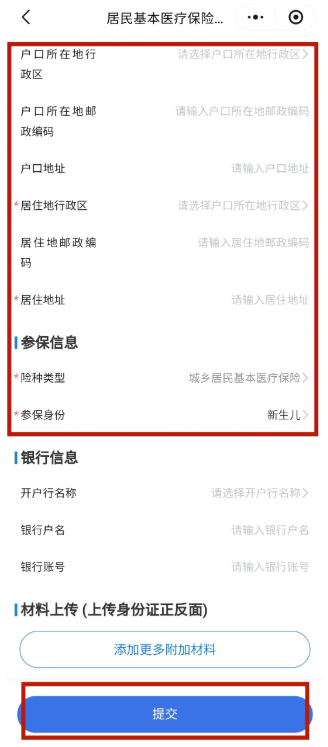 第四步:填写登记所需信息,上传证明材料(户口本、出生医学证明等),在页面最底端点击提交;